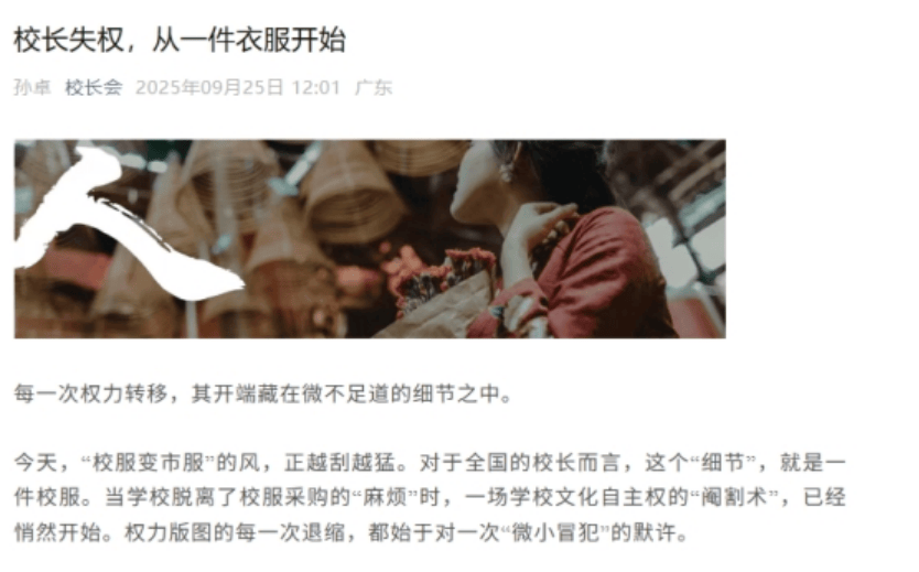 对于学校来说,校服是一股校徽、一种精神图腾、一种文化传承的血脉。一所学校几十年甚至上百年所积累的校风、校训和历史遗产,都可以通过条纹、色彩和独特的设计来浓缩。它是学生对母校的认同,是校友之间的身份密码,是校园文化建设的重要组成部分。然而,“市政服务”模式粗暴地剥夺了学校的文化表达权,迫使数百所历史和理念不同的学校“格式化”,减少了多元化的教育机构。在没有灵魂的、可互换的标准生产线上……当校服只标注“我们城市”的代号,不再讲述“我们学校”的故事时,母校的鲜明印记就被无情地抹掉了。